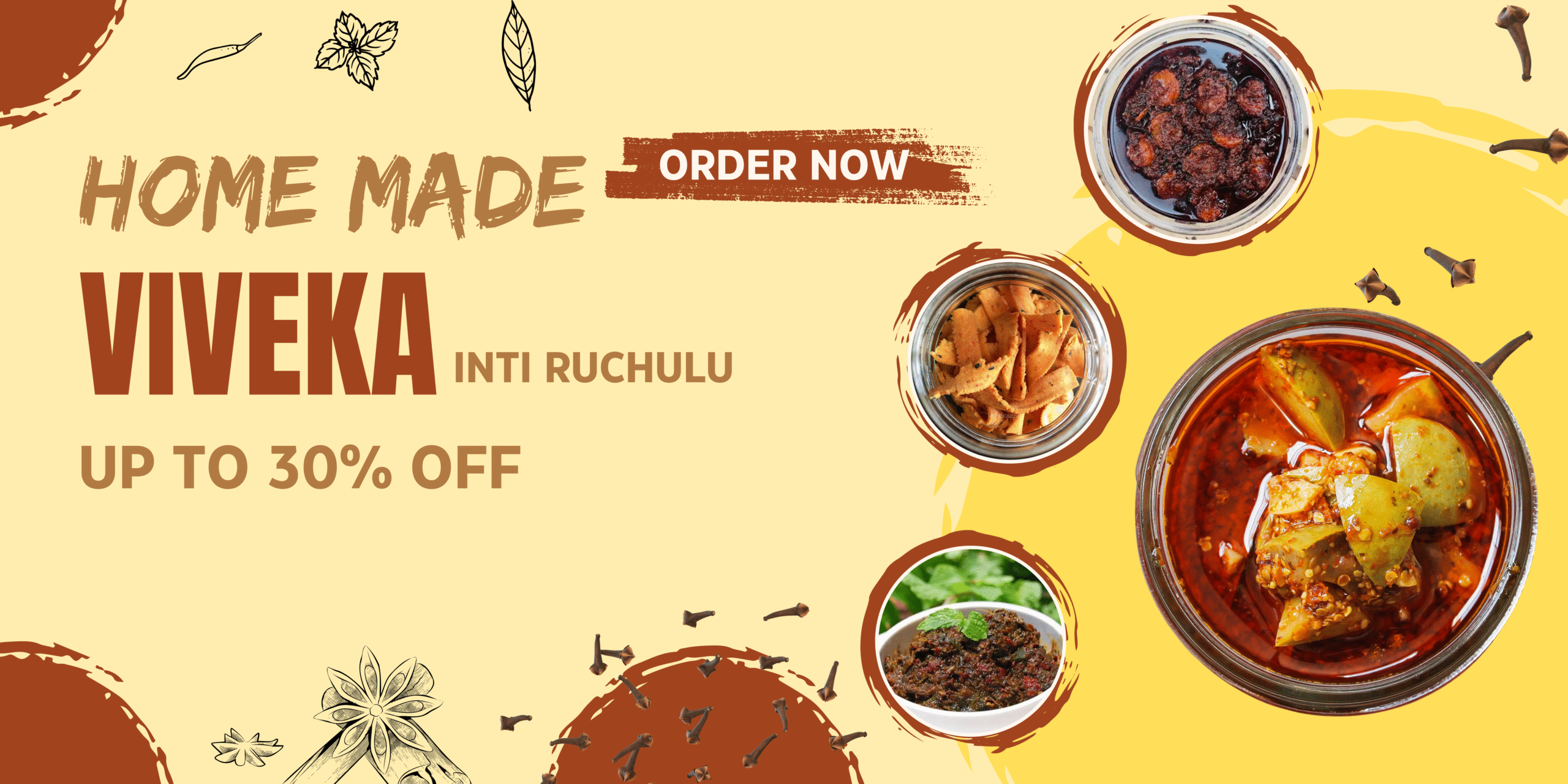 Viveka Inti Ruchulu is a homemade food brand committed to delivering authentic, traditional flavors. We specialize in fresh, preservative free vegetarian and non-vegetarian pickles, sweets, snacks, spices, and powders crafted with care and high quality ingredients. Our mission is simple: to bring the true taste of home to every meal.